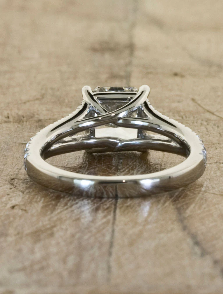 We sourced a breathtaking radiant cut diamond for a client and set it on a platinum diamond-accented double arching band. Yet another unique and timeless piece by KDD.