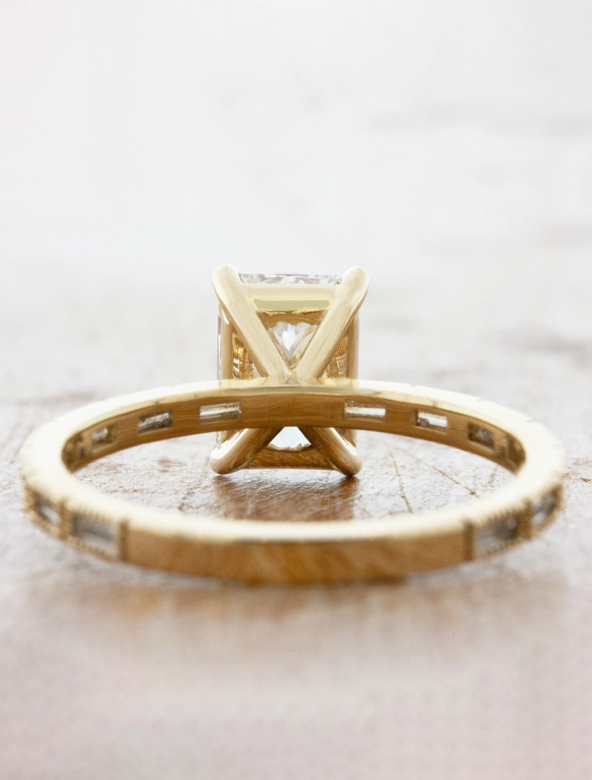 Afrik is a unique, Art Deco inspired design that holds a gorgeous radiant cut center diamond with old world baguette diamonds on the band. The result is a decidedly modern look with a twist of vintage flair.