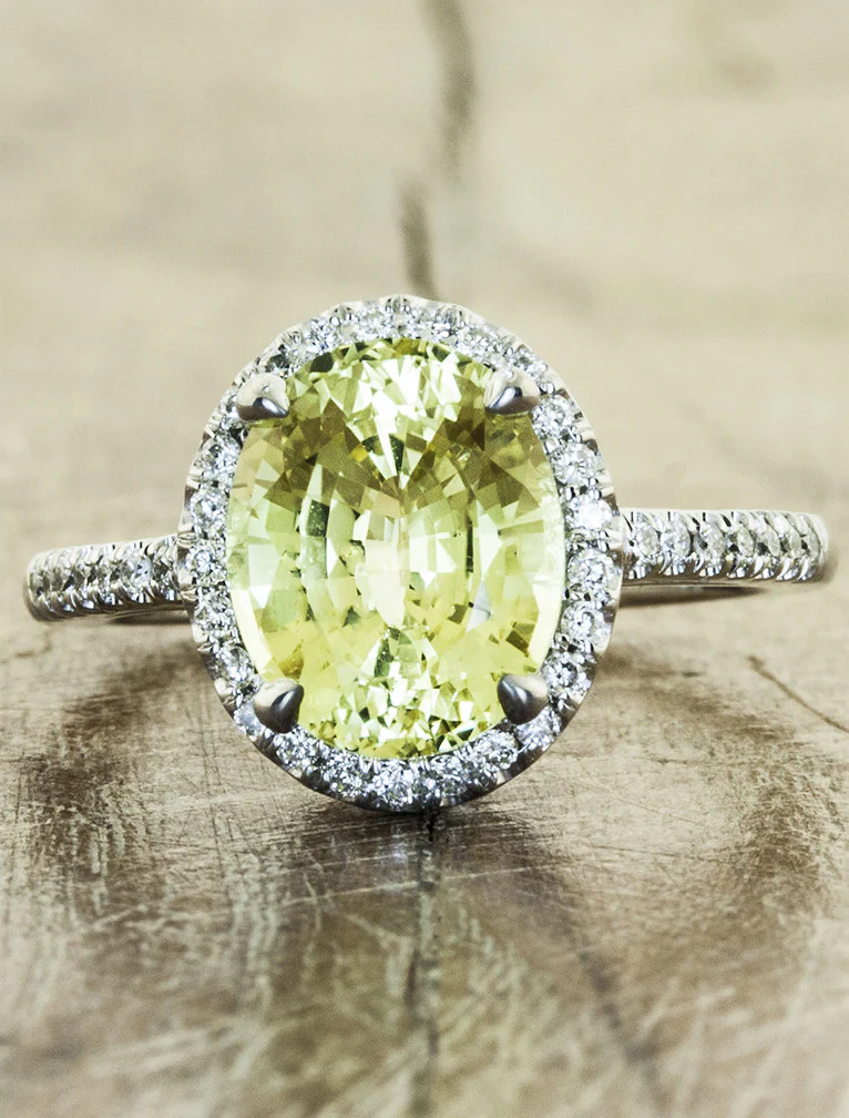 Camilla exhibits a sparkling 3.68 carat cultured blue sapphire. It’s truly the heart of the ocean. The beautiful oval shape and checkerboard cut create a classic feel, while the deep blue color gives a sense of mystery. Camilla features a glittering halo of diamond accents totaling 0.30ct in weight and is set in recycled 14k white gold. Handmade in NYC.