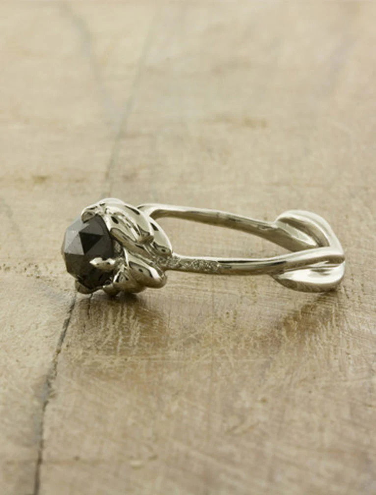 This sculptural beauty features a 1 carat rose-cut black diamond, encircled by sculptural arcs and set in a classic 4-prong 14k White Gold setting. The setting is crafted in recycled platinum and the band is delicately sprinkled with white diamonds. Handmade in NYC.