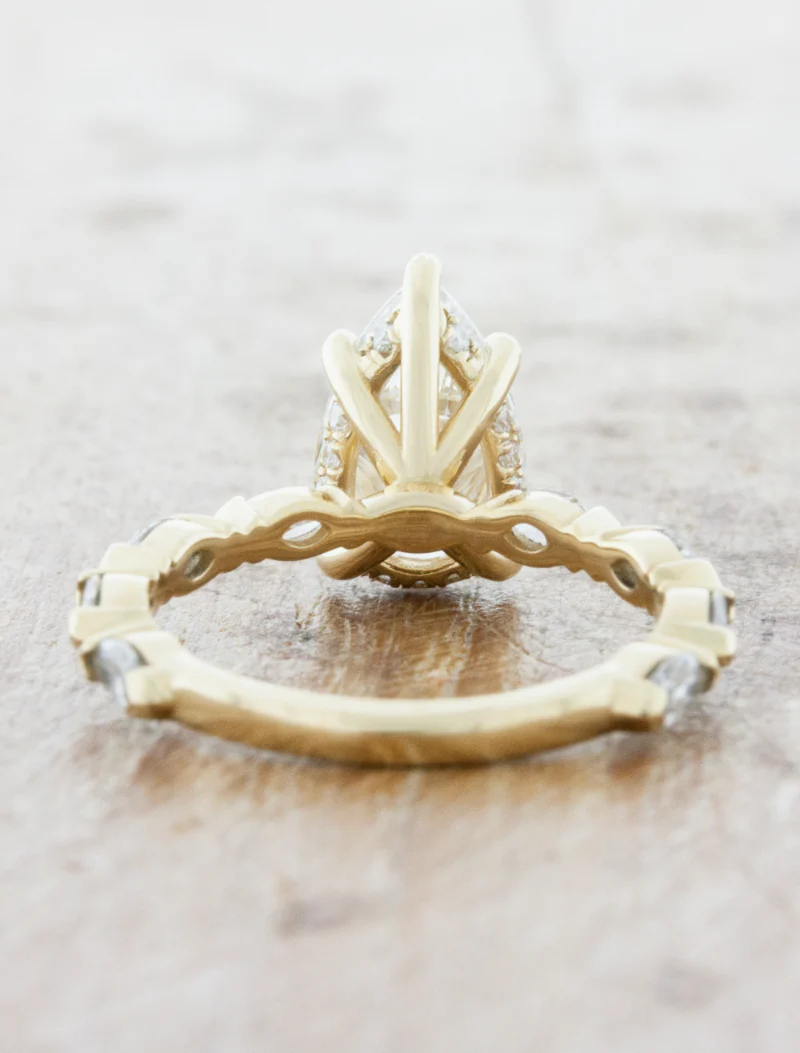 Inspired by our Carissa design, Elaine is a pear cut diamond engagement ring featuring a hidden halo and a delicate band with marquise shape diamonds. Our signature leaf detailing is carved into the center stone prongs.