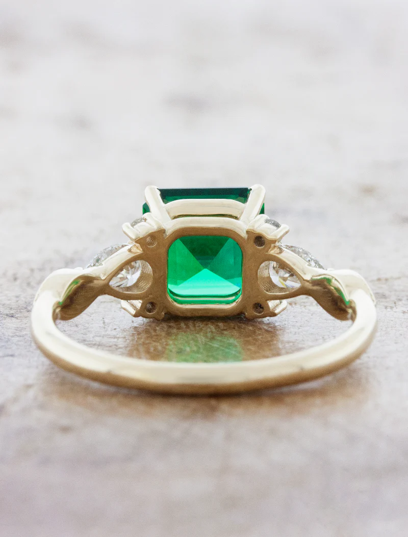 Immerse yourself in the captivating allure of our Gracie ring. Brimming with elegance, this engagement ring highlights a vivid green Asscher cut emerald gemstone accompanied by shimmering clusters of round and pear shaped diamonds. The vintage-inspired design lends a regal air, making the piece extra special.