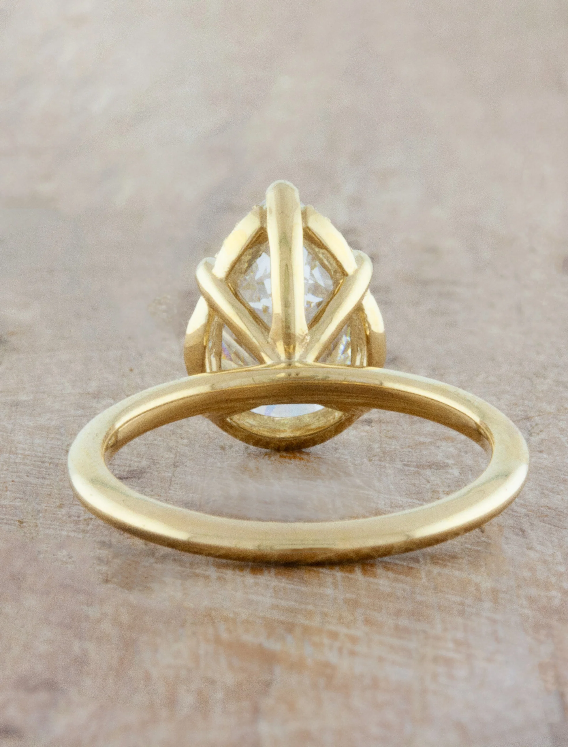 Isabella features a brilliant pear shaped conflict-free diamond sitting atop the band. In this design, the diamond is guarded by five handcrafted leaf-like prongs - a subtle tip of the hat to nature and the circle of life. We then sprinkled some diamonds along the ring's gallery to give it extra sparkle and a peek-a-boo halo.