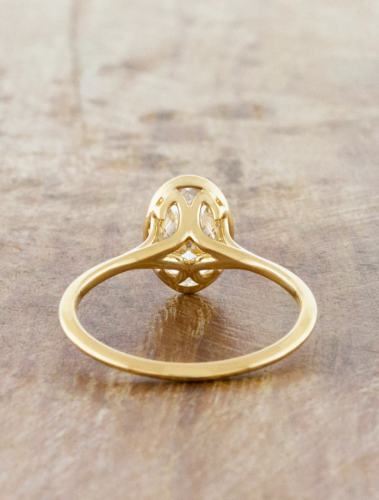 Myra - where elegance meets simplicity. This chic bezel set solitaire features a sleek design that embraces modern minimalism. The perfectly smooth, contoured bezel encircles a stunning oval cut diamond with hidden scrolls and swirls for a kiss of vintage appeal.