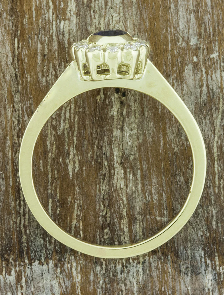 Patricia exudes an air of delicate grace, where romance meets regal sophistication. At its heart lies a breathtaking oval blue sapphire encircled by a halo of shimmering diamonds.