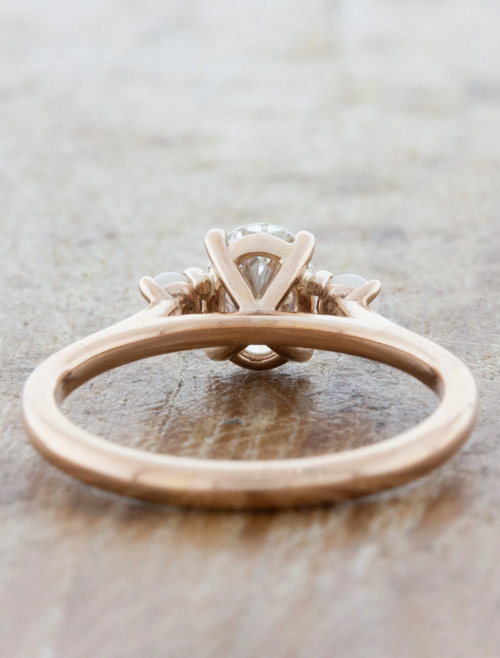 Percy is an amazing example of vintage flare with its soft looking 14k rose gold color and the very feminine opal side stones that glisten like the moon. Her 0.90ct G color VS1 clarity oval center diamond is just one of the many fascinating aspects of this piece. Her beauty is beyond words.