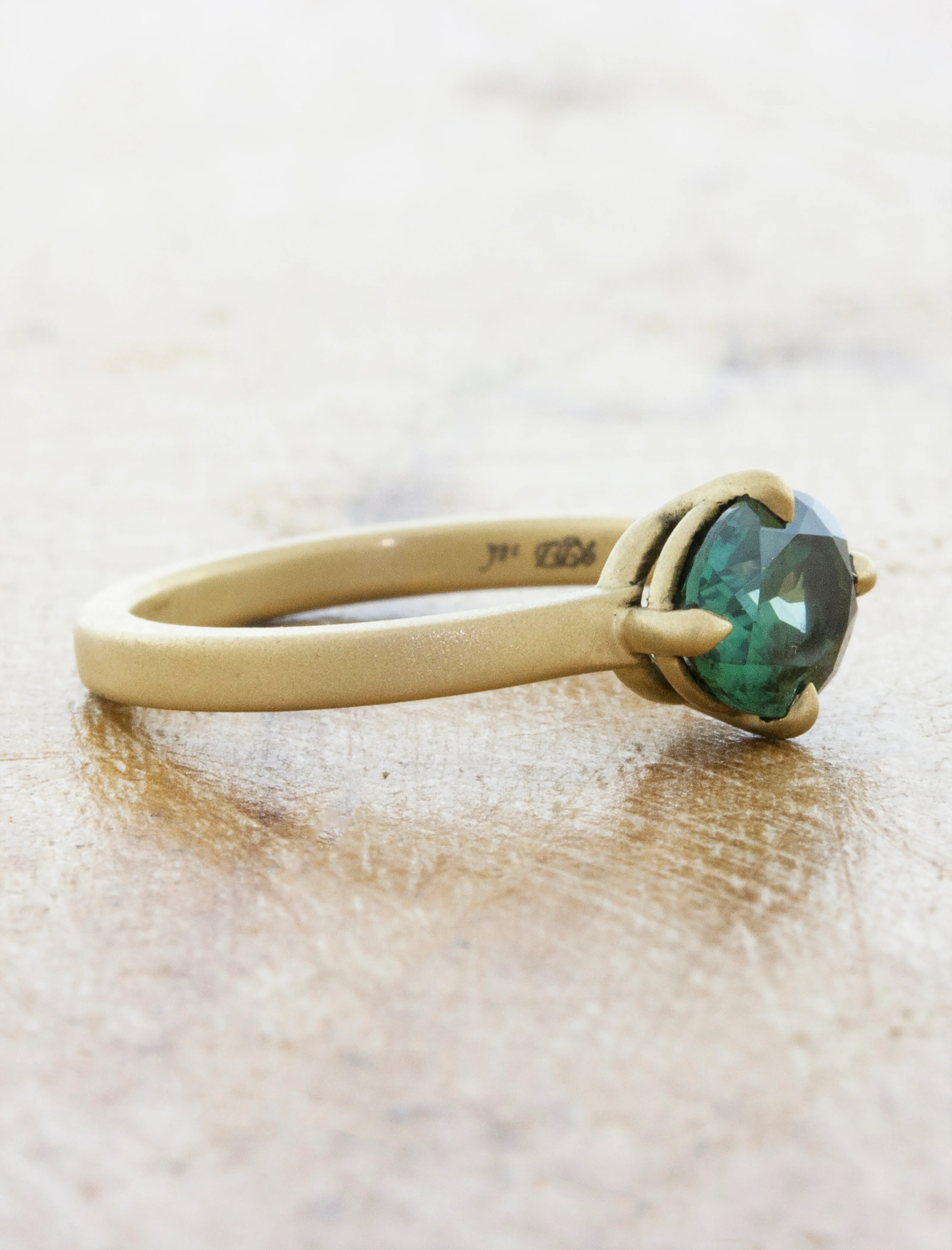 Roe features a bold brushed metal setting crowned with a striking east-west sapphire blending sleek minimalism with captivating color. Its clean lines and confident design make a statement of modern elegance.