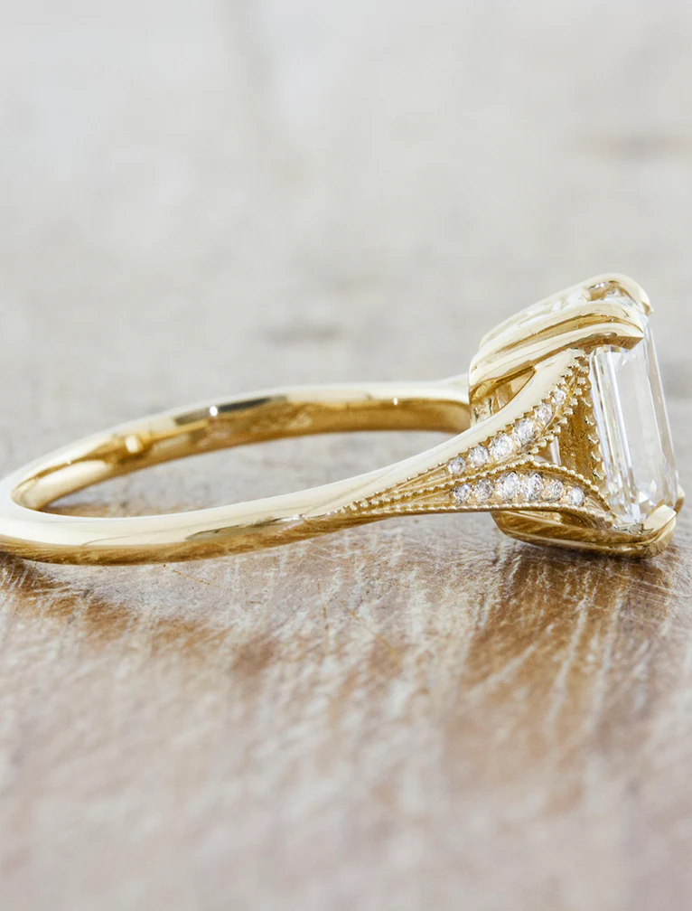 Lexeen is elegance and sophistication wrapped into one. She is set with an exquisite emerald cut diamond that is surrounded by subtle double claw prongs. Laced with diamonds, her split band mimics a hug, representing love and comfort.