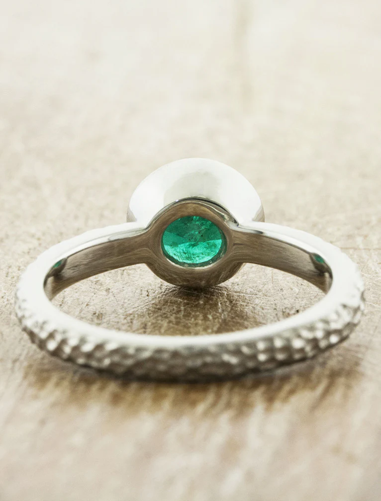 This cool piece, called Lucy, was created in platinum and blends harmoniously with a bezel-set round emerald stone. She exhibits hand crafted hammered texture along the band for that extra fresh appeal. The Lucy is ideal for the woman who prefers a minimal engagement ring with vivid color!