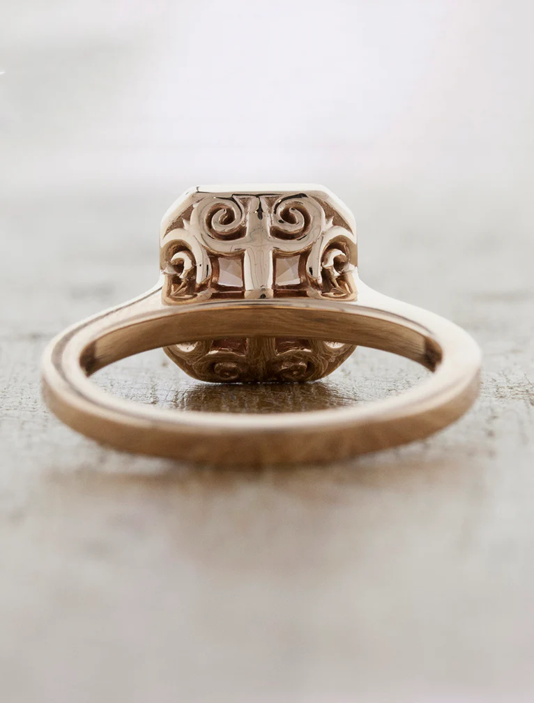 We sourced a brilliant and rare Padparadscha sapphire and set it in a rose gold band with a white diamond halo and pave that runs down not only the sides. Underneath the basket there is a peek- a - boo of design and intricacy.
