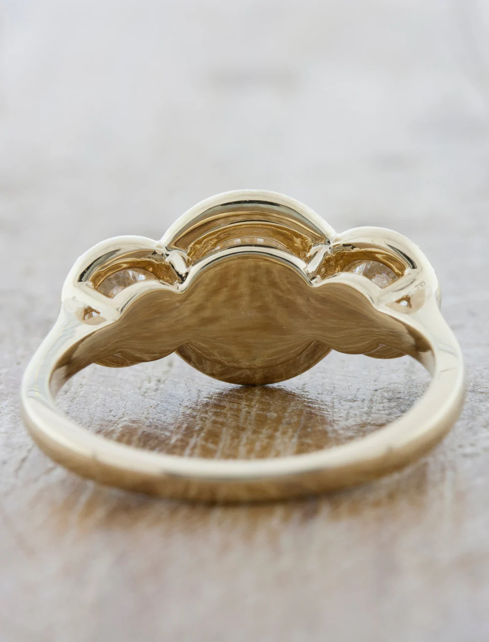 The Inolah engagement ring emanates classiness and refinement. She features three sparkling round cut natural diamonds, each framed by a halo for a touch of glamour. Her old world feel is fit for a queen and her three halos are the crown to prove it.