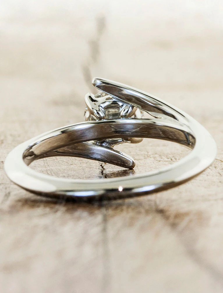 Our client wanted something unique and modern - yet something with a bit of twist - her wish was our command. In the center of this beautiful platinum setting you will find a vibrant round diamond secured within a bypass band design.