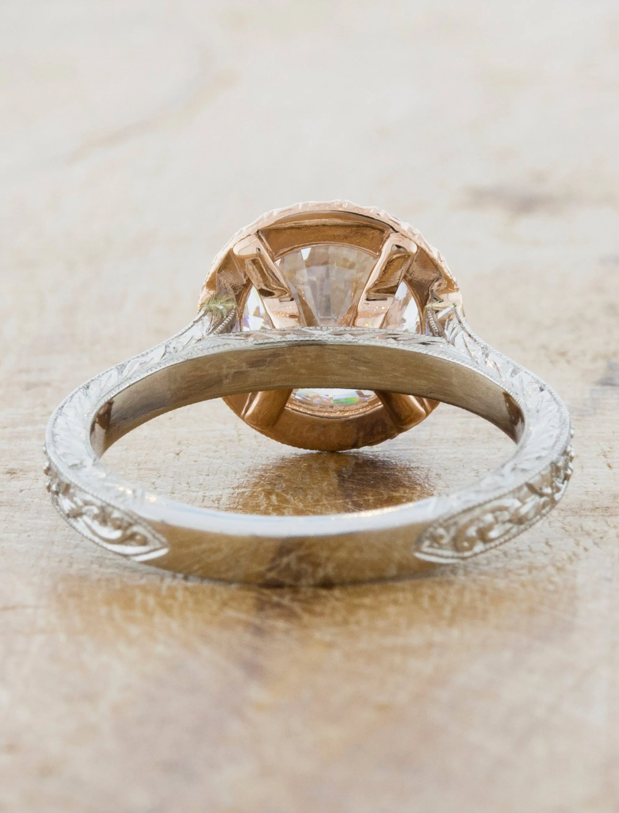 Gypsy is different - something simple, sweet, organic and elegant all rolled into one. Her heart is set with a wondrous, round diamond which is nestled in a beautifully designed white gold or platinum band with a dazzling 14k rose gold diamond filled halo. All around her you find hand-engraved details that make her extra special. She is a very unique piece - don't let her pass you by. Handmade in NYC.