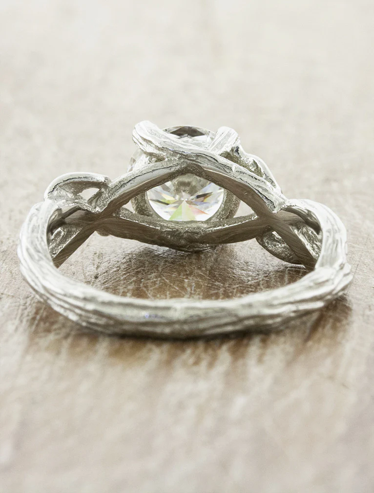 The Lorelei engagement ring is a poetic fusion of nature and elegance, featuring intertwining bands with organic leaf and bark textures that evoke a forest's quiet magic. Nestled at its heart is a gorgeous round cut diamond, adding a radiant sparkle to this symbol of everlasting love. It's a design that feels both enchanted and enduring—perfect for the nature-loving romantic.