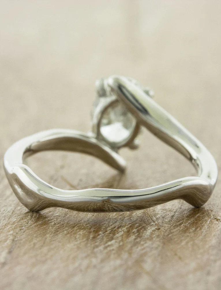 The Lorax engagement ring features an organic bypass design that cradles a captivating oval diamond, symbolizing a heart at the center of nature’s embrace. Its split band, textured with natural, earthy detail and delicately sprinkled with diamonds, evokes a sense of wild beauty and timeless love.