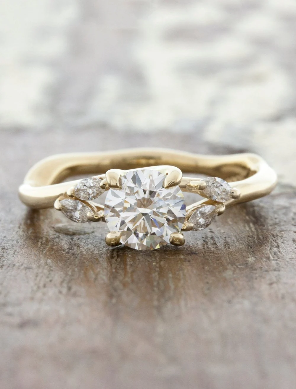 The Adamaris is simply exquisite in all her nature-inspired glory. An amazing round cut center stone sits like a queen in the center of this band: set in a classic 4-prong setting, but with a leafy hand engraved twist and stunning marquise diamonds that say hello every time you look at them.