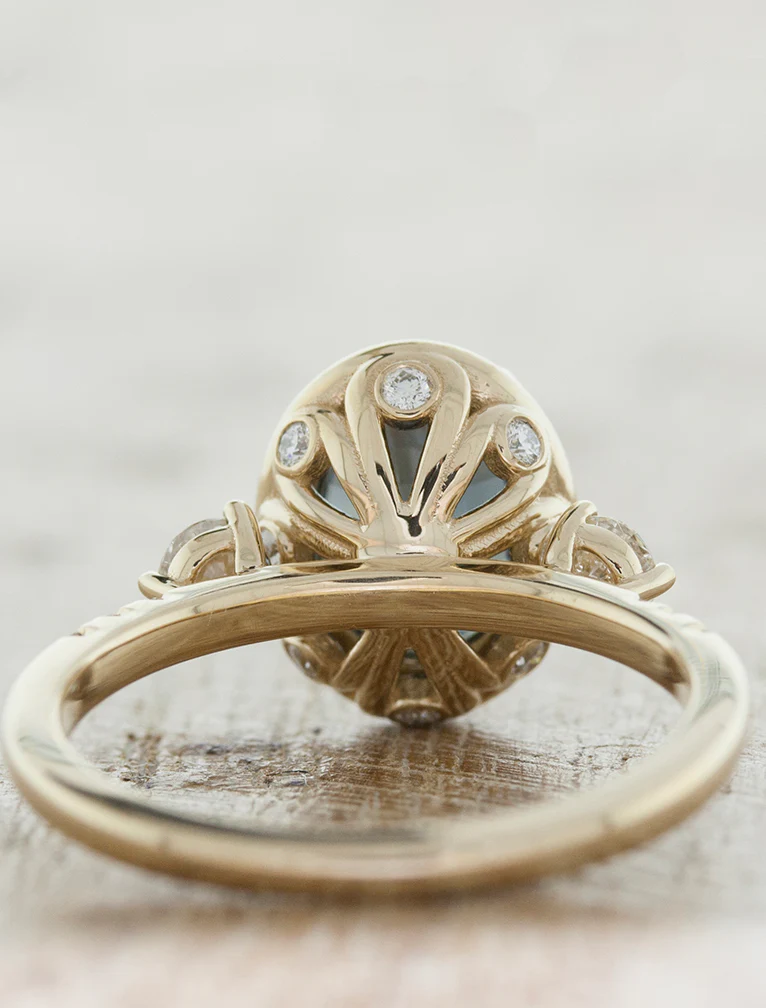 Sophie showcases an elegant oval center stone flanked by two round side stones, creating a timeless three-stone silhouette. A pavé band and halo enhances the design with shimmering detail, symbolizing a past, present, and future filled with brilliance.