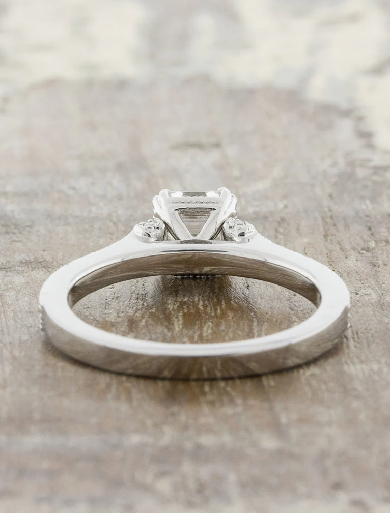 Jennie dazzles and she smiles. We sourced an asscher cut brilliant diamond and then encased it in a hand engraved trimmed gallery designed to take your breath away. She has vintage-inspired trimmings throughout as well as two half moon shaped designs smoldered in diamonds on each side of the center asscher.