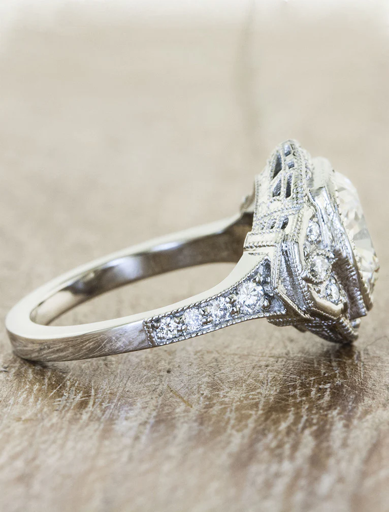 The Paulina is nothing but captivating. We sourced a beautiful 3ct diamond, and surrounded her with sparklers and hand engraved details - details that speak royalty. The intricate detail in every nook of this ring makes her stand out above the rest.