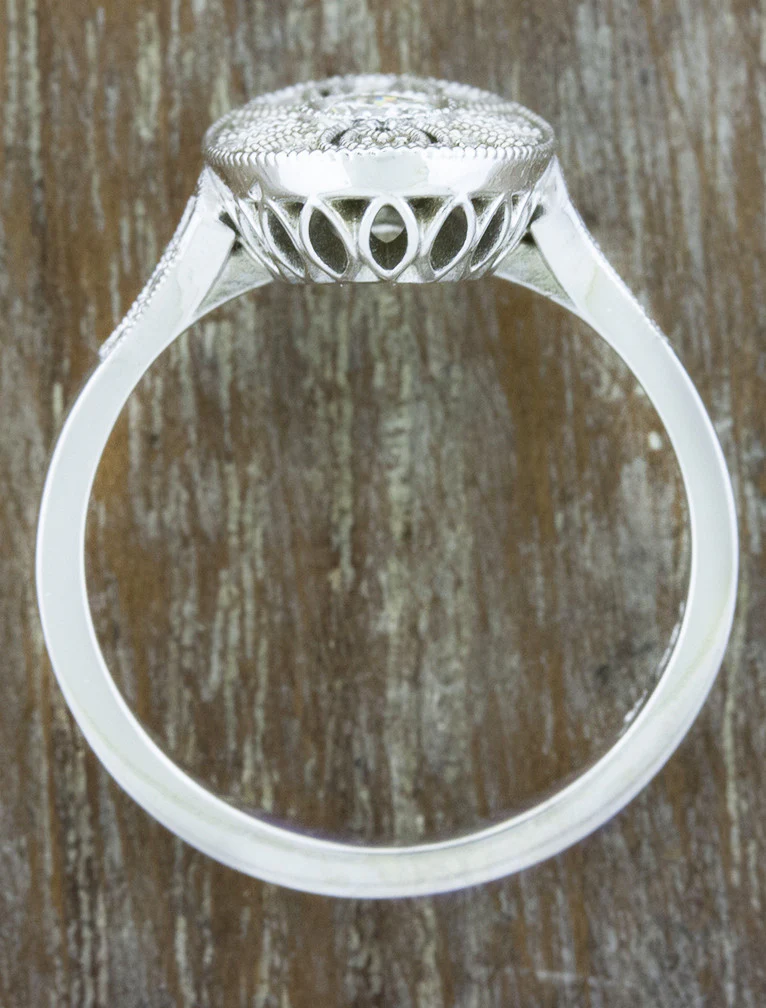 Aurelia oozes refinement and elegance with tons of vintage appeal. She's an Edwardian inspired design with an intricate band featuring beautiful filagree and milgrain details along each side and sparkles like you wouldn't believe. She is set with brilliant white diamonds weighing 0.33ct. She is so majestic that she completely takes your breath away at first glance. Her ornate basket is a magnificent surprise.