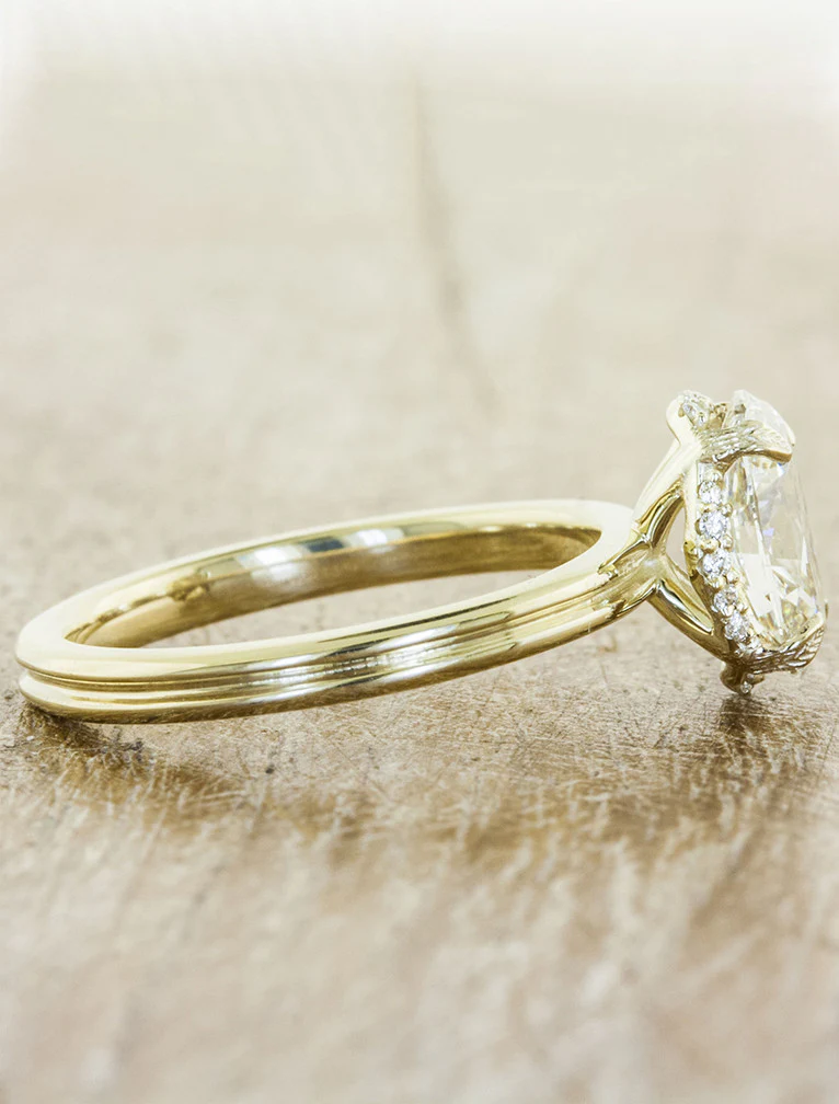 The Reposa is truly exquisite. A brilliant conflict-free diamond sits atop the band and in this design its guarded by four handcrafted leaf like prongs - a subtle tip of the hat to nature and the circle of life. We then sprinkled some diamonds along the ring's gallery to give it extra sparkle and a peek-a-boo halo. The finishing touch was to make a double band - one complete circle for each person making the promise of love.